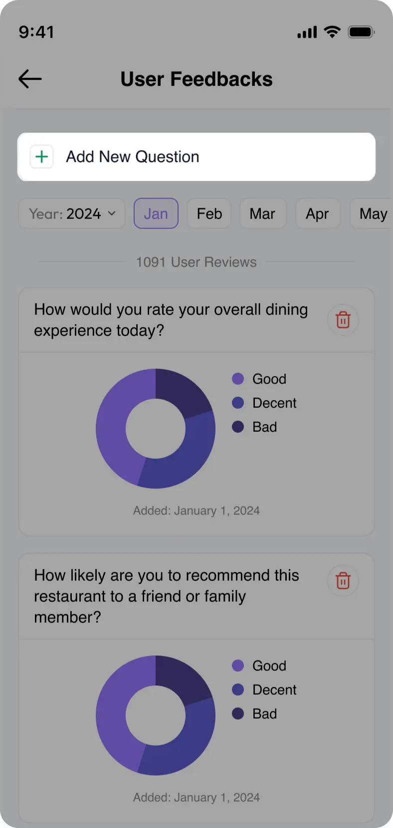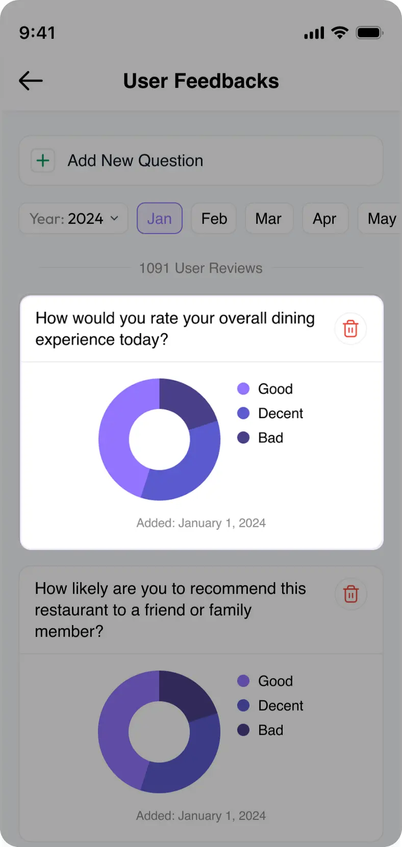 Know your customers create a survey and ask your guests whatever you want to know. Manage your questions and add new ones or delete some whenever you like.