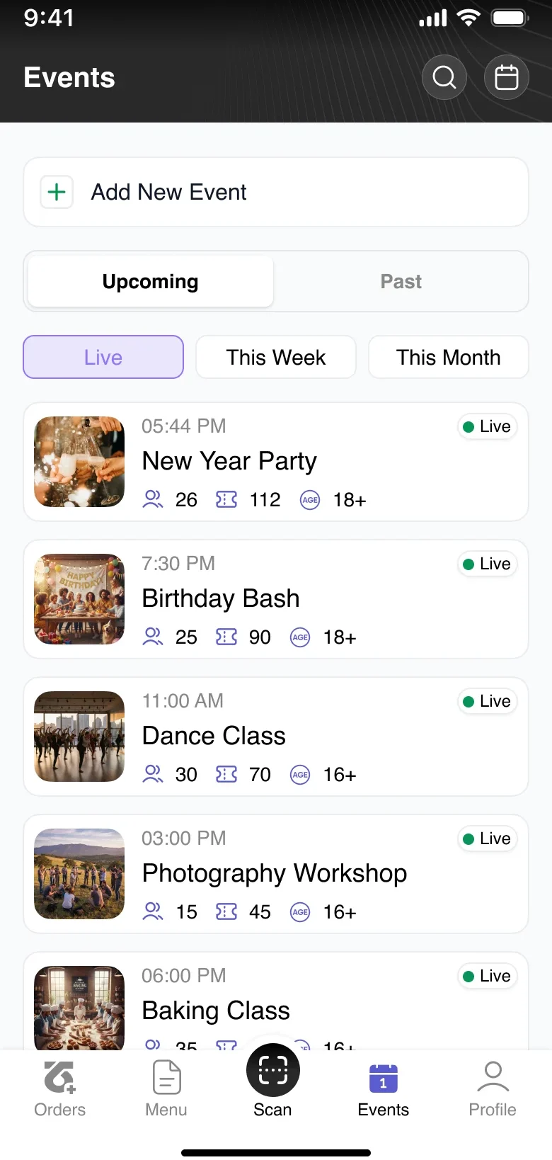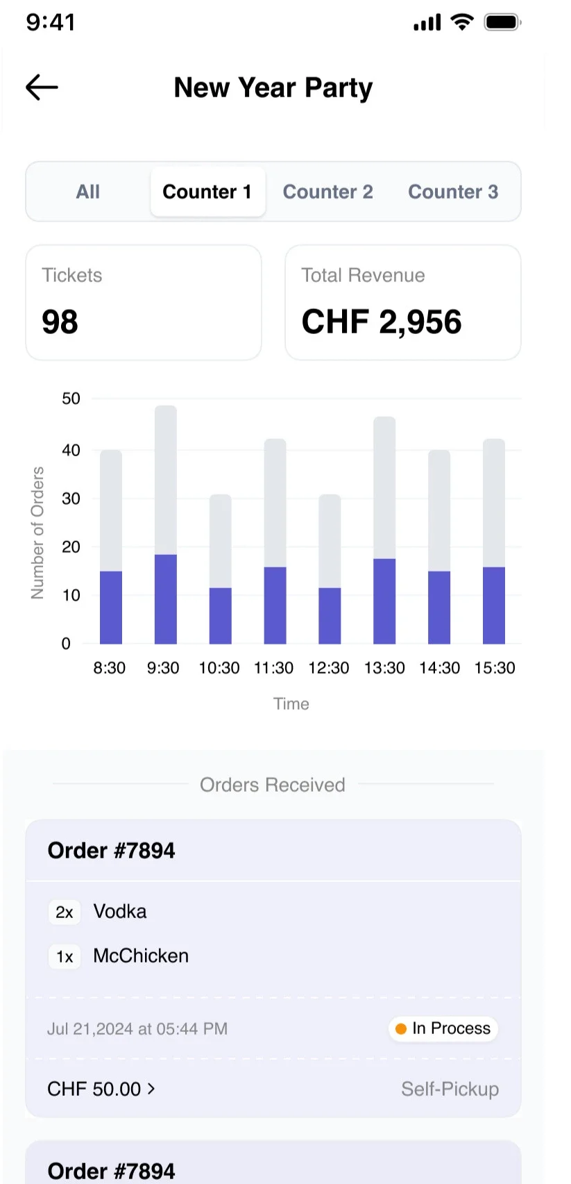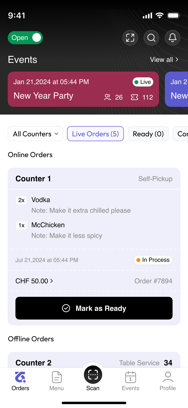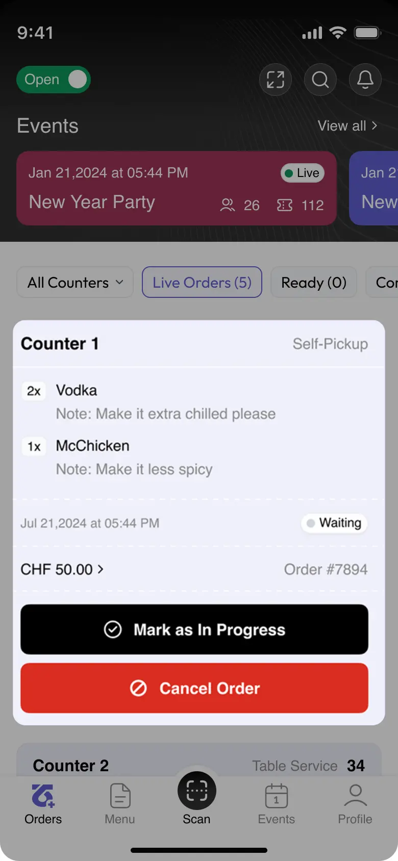 Your staff manages all the current orders in the Live section. By scrolling up, they can view past orders, ensuring a complete overview of all transactions.